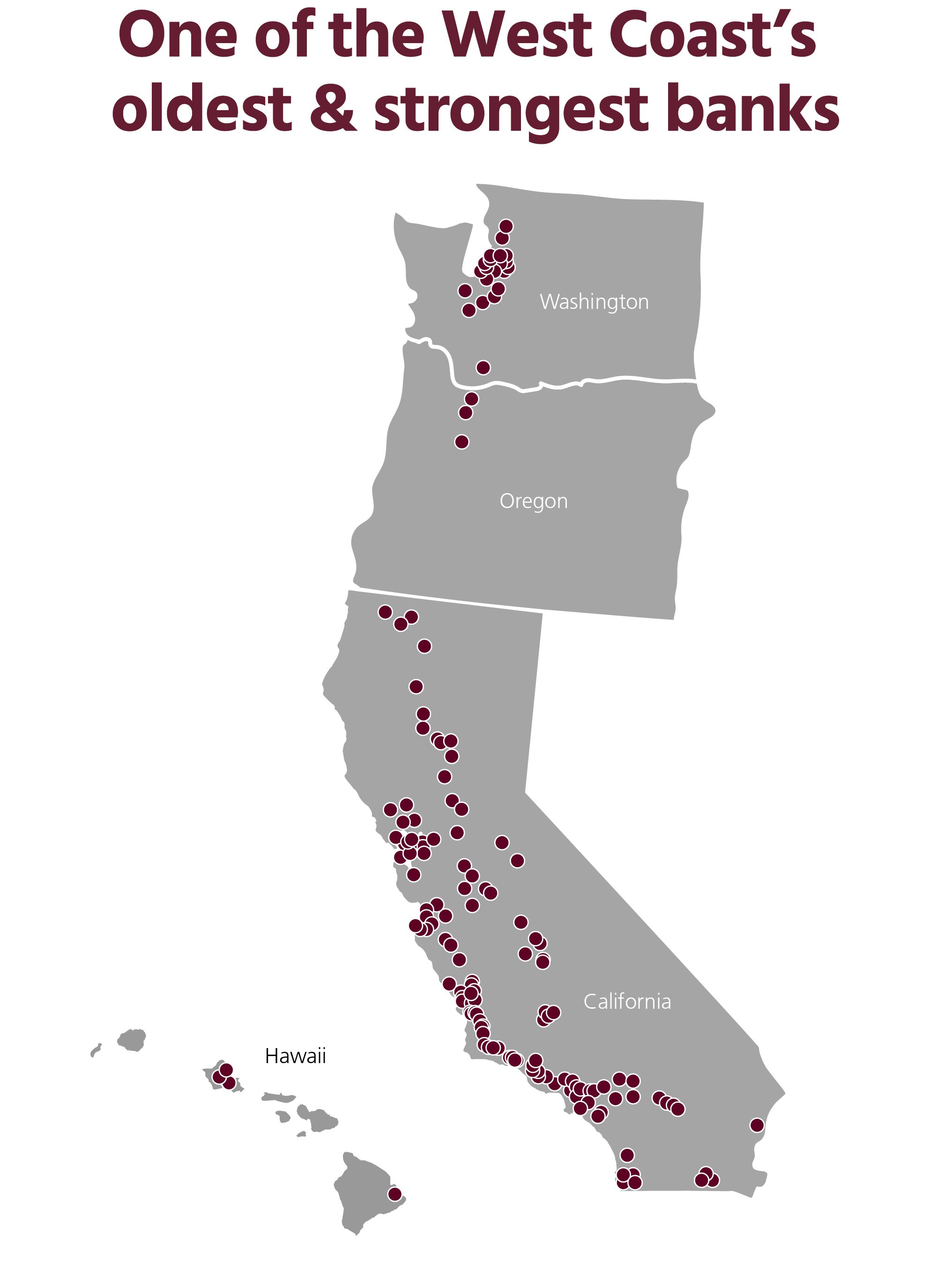 Together, we will provide you an even broader, more convenient network of 166 branches throughout California, the Pacific Northwest and Hawaii – and you’ll still be greeted by the same familiar faces at the same convenient locations.